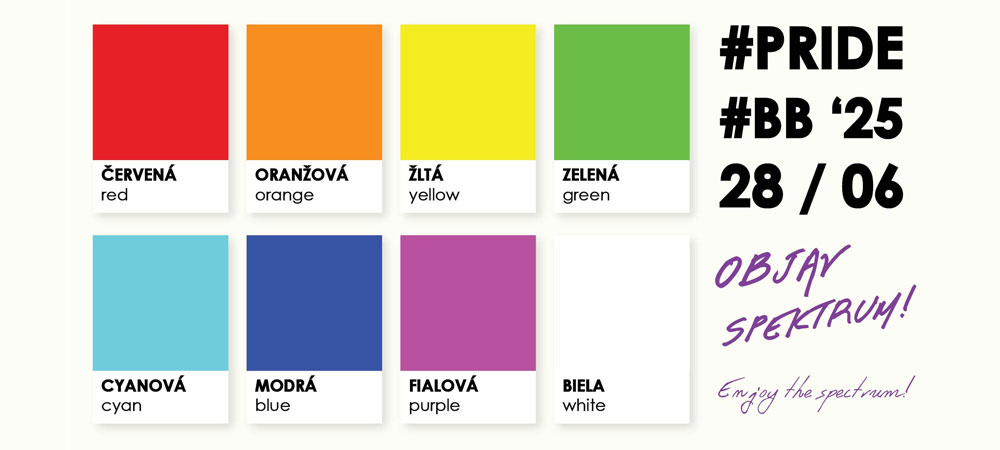 Ôsmy ročník #PRIDE #BB / SPEKTRUM je oslavou šírky všetkých škál a stupníc! SPEKTRUM začali ľudia pozorovať, aby zachytili zložitosť viditeľného sveta trochu jednoduchšie. SPEKTRUM nachádzajú v potrebách, emóciách, hodnotách, rodoch, dňoch, tónoch, metrickej sústave či na Allportovej škále predsudkov.